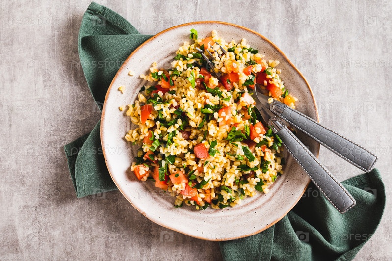 Крупный план салата табуле с булгуром, помидорами и петрушкой на тарелке на столешнице