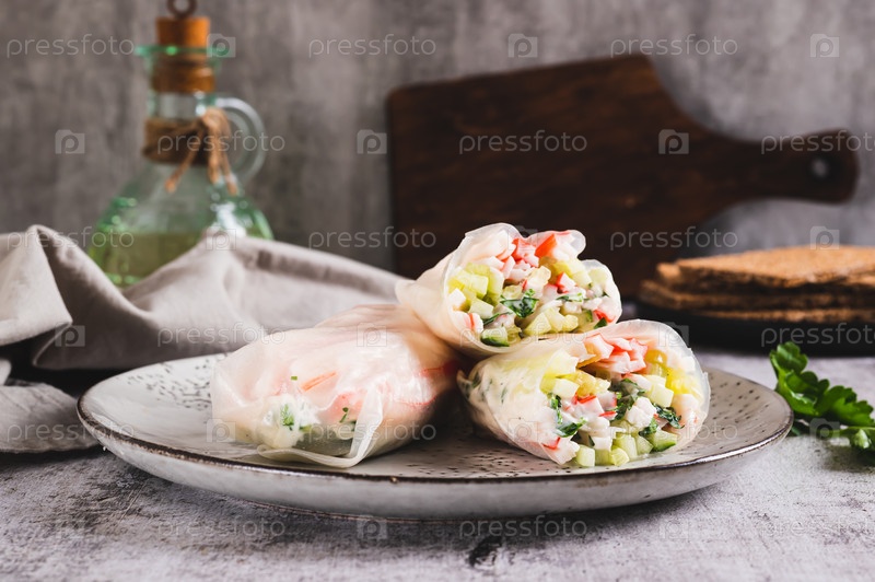Спринг-роллы в рисовой бумаге с крабовыми палочками, огурцом, зеленью и соусом на тарелке на столе