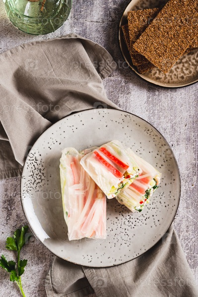 Спринг-роллы с крабовым мясом, огурцом и зеленью на тарелке на столешнице и вертикальный вид