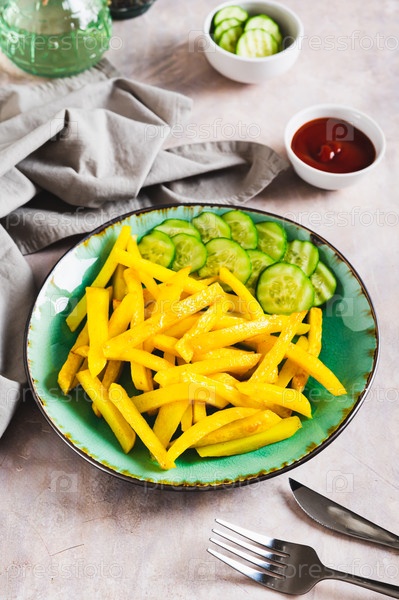 Тарелка вкусного картофеля фри с огурцом и кетчупом на столе вертикальный вид