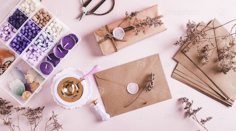 Креативный набор для запечатывания конвертов и подарков сургучной печатью на розовом веб-баннере сверху