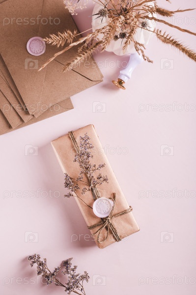 Подарок в крафтовой бумаге с сургучной печатью и сухоцветами на розовом верхе и вертикальным видом