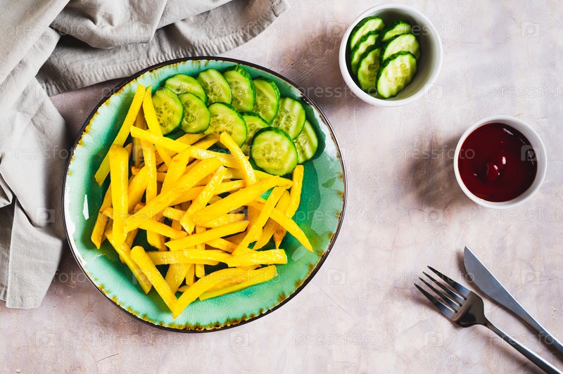 Аппетитный картофель фри и ломтики огурца на тарелке на столешнице