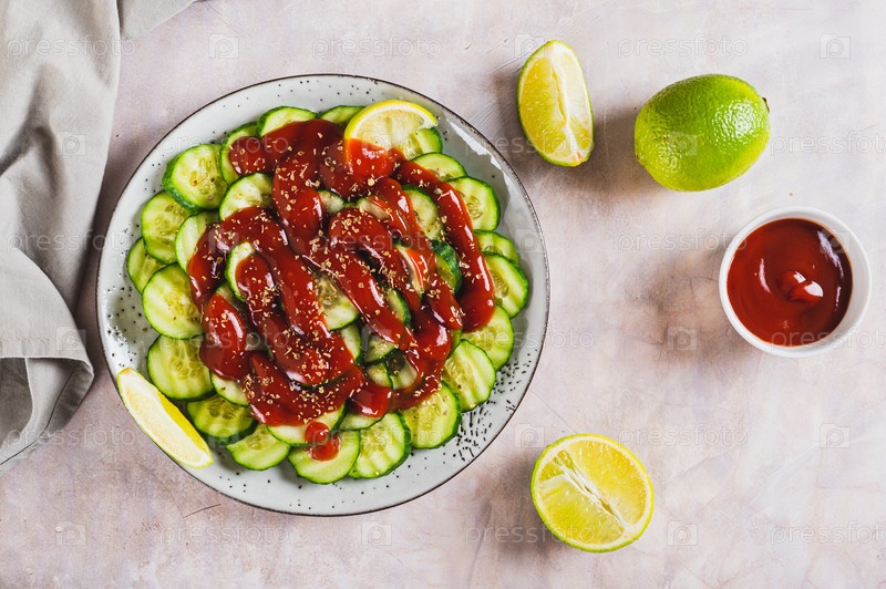 Мексиканские острые огурцы с соусом чили и лаймом на тарелке на столешнице