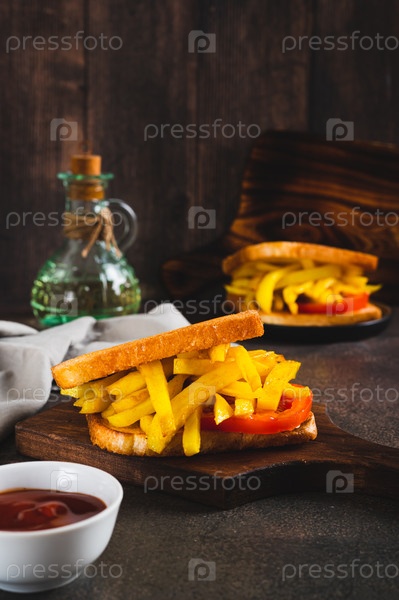Жареные тосты с картофелем фри и помидорами на доске на столе вертикальный вид