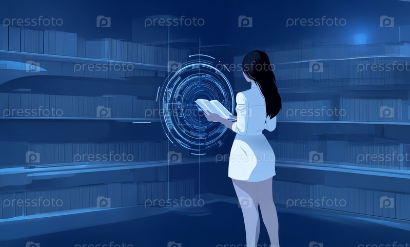 Молодой студент использует технологию голограмм и искусственный интеллект для поиска книги в библиотеке. Сгенерированное изображение