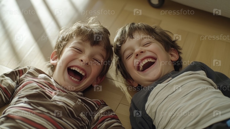 Отец радостно обнимает своих сыновей дома, лежащих на полу и обменивающихся смехом. Сгенерированное изображение