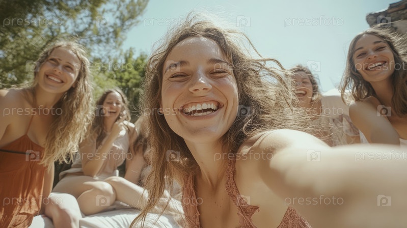 Счастливая женщина делает селфи с друзьями во время пикника на природе. Сгенерированное изображение
