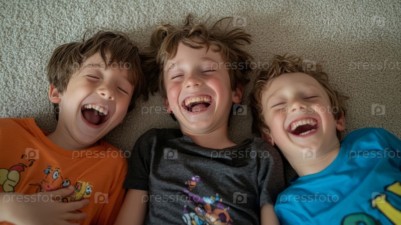 Отец радостно обнимает своих сыновей дома, лежащих на полу и обменивающихся смехом. Сгенерированное изображение