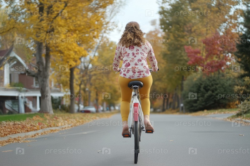 Уверенная в себе женщина размера «плюс» наслаждается поездкой на велосипеде свежим осенним утром. Сгенерированное изображение