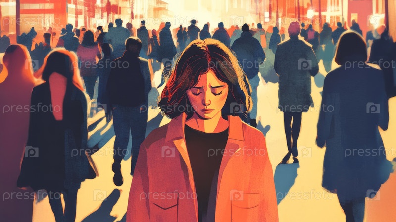 Женщина, испытывающая паническую атаку на оживленной городской улице, окруженная толпой, но при этом чувствующая себя изолированной и подавленной. Сгенерированное изображение