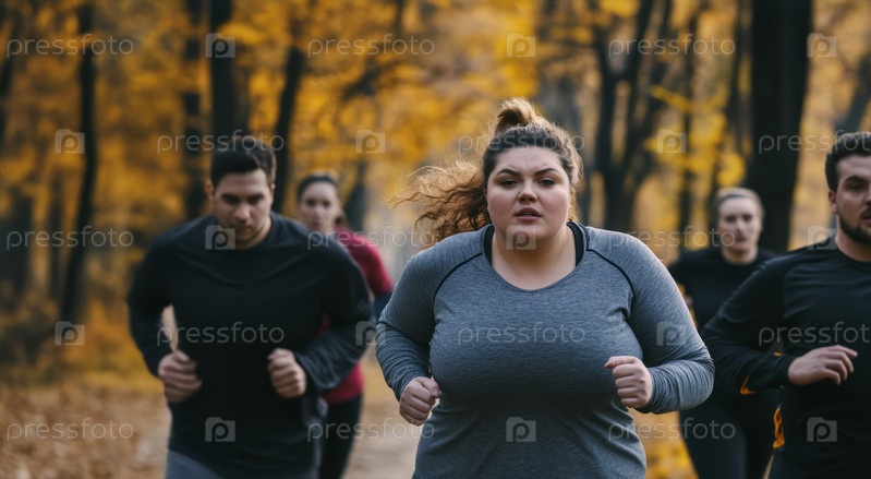 Команда молодых мужчин и женщин plus-size бегает вместе в парке, тренируется на открытом воздухе осенью. Сгенерированное изображение