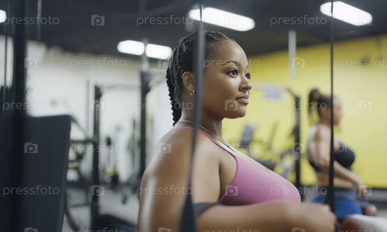 Женщина размера плюс тренируется с персональным тренером в современном спортзале. Сгенерированное изображение