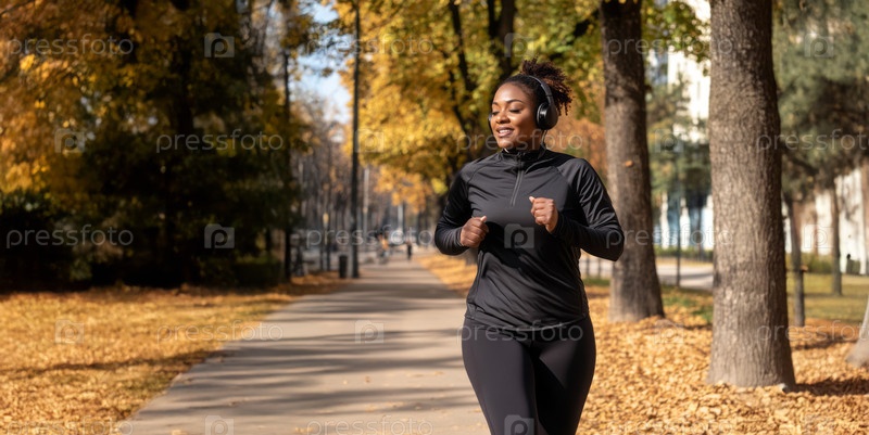 Уставшая африканская женщина размера «плюс» бежит по городскому парку осенним утром с наушниками. Сгенерированное изображение