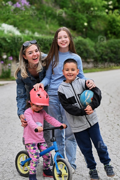 Группа счастливых людей, в том числе две женщины, мальчик с мячом и маленькая девочка на беговеле в шлеме, наслаждаются активным отдыхом на мощеной дорожке, окруженной зеленью