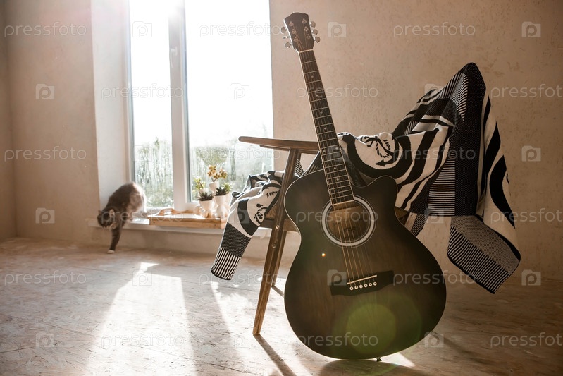 Гитара. Гитарные аккорды. Акустическая гитара. Музыка. Музыкальный фон. Изображение акустической гитары в комнате с ретро-креслом. Жесткий свет. Тени