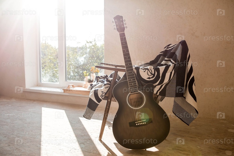 Гитара. Гитарные аккорды. Акустическая гитара. Музыка. Музыкальный фон. Изображение акустической гитары в комнате с ретро-креслом. Жесткий свет. Тени