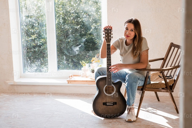Талантливая молодая женщина-музыкант сидит одна и сочиняет песни на гитаре. Она играет спокойную мелодию на музыкальном инструменте.Музыка и хобби