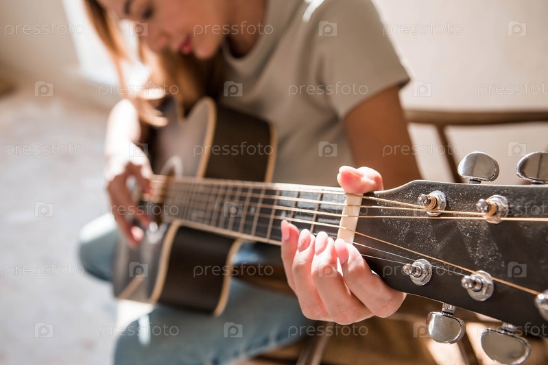 Талантливая молодая женщина-музыкант сидит одна и сочиняет песни на гитаре. Она играет спокойную мелодию на музыкальном инструменте.Музыка и хобби