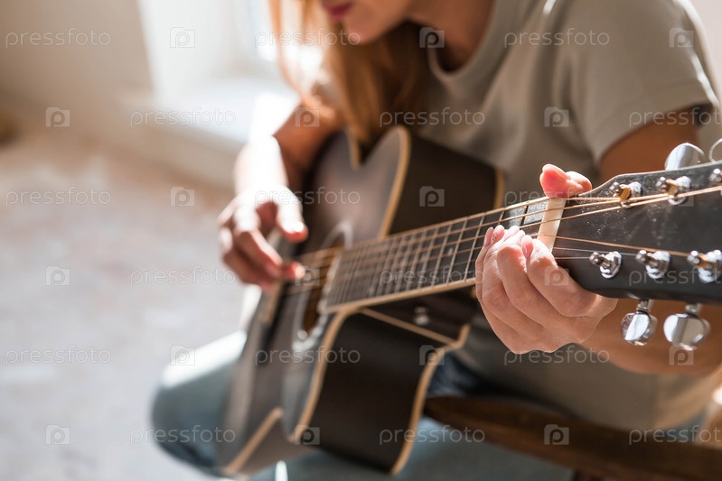 Талантливая молодая женщина-музыкант сидит одна и сочиняет песни на гитаре. Она играет спокойную мелодию на музыкальном инструменте.Музыка и хобби