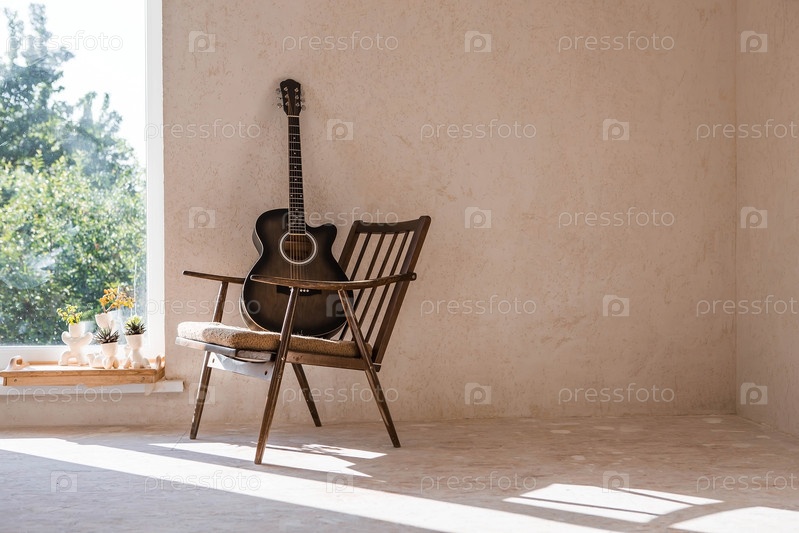 Гитара. Гитарные аккорды. Акустическая гитара. Музыка. Музыкальный фон. Изображение акустической гитары в комнате с ретро-креслом. Жесткий свет. Тени