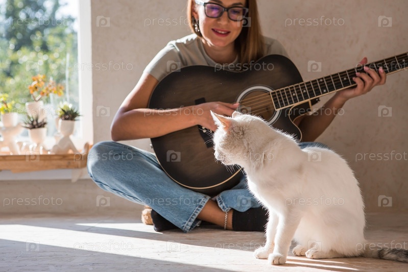 Талантливая женщина-музыкант сидит с котом и сочиняет песни на гитаре. Она играет спокойную мелодию на музыкальном инструменте. Музыка и хобби
