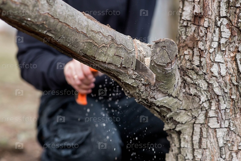 Обрезка веток плодового дерева садовой пилой. Ручная пила в руках мужчины. Крупный план распиловки деревьев, Уход за деревьями. Садоводство. Подготовка сада к летнему сезону