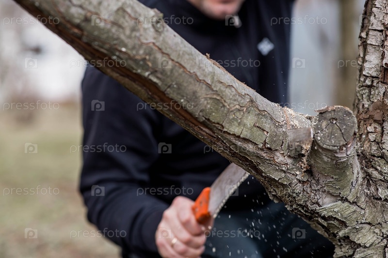 Обрезка веток плодового дерева садовой пилой. Ручная пила в руках мужчины. Крупный план распиловки деревьев, Уход за деревьями. Садоводство. Подготовка сада к летнему сезону