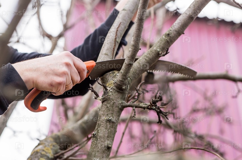 Обрезка веток плодового дерева садовой пилой. Ручная пила в руках мужчины. Крупный план распиловки деревьев, Уход за деревьями. Садоводство. Подготовка сада к летнему сезону