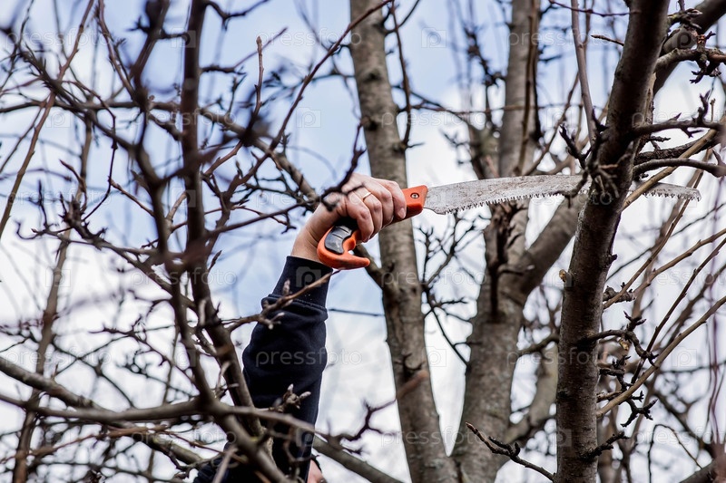 Обрезка веток плодового дерева садовой пилой. Ручная пила в руках мужчины. Крупный план распиловки деревьев, Уход за деревьями. Садоводство. Подготовка сада к летнему сезону