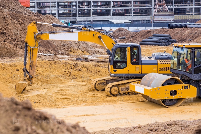 Тяжелая техника для земляных работ и благоустройства. Крупный план экскаватора и дорожного катка на строительной площадке. Экскаватор выкапывает грунт для земляных работ и строительства