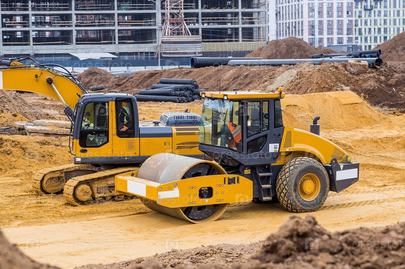 Тяжелая техника для земляных работ и благоустройства. Крупный план экскаватора и дорожного катка на строительной площадке. Экскаватор выкапывает грунт для земляных работ и строительства