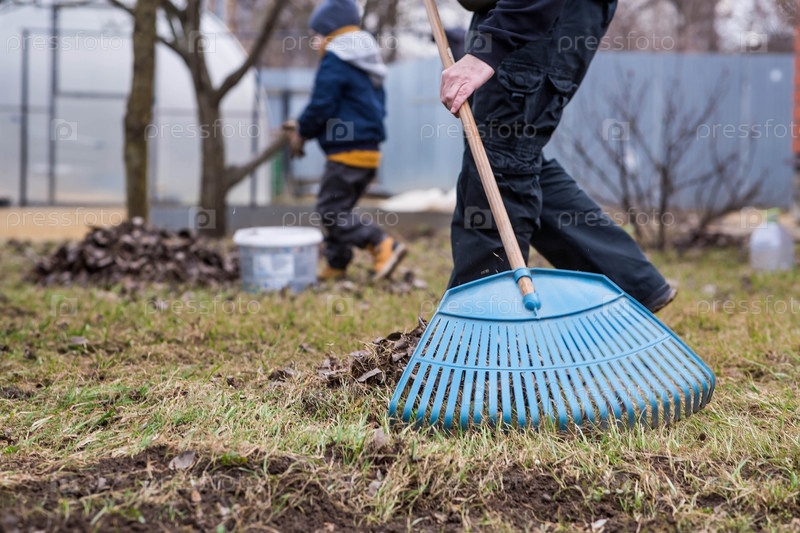 Куча старых листьев, мужчина и ребенок делают весеннюю уборку в саду. Очищает газон от листьев. Садоводство. Уборка и подготовка сада к летнему сезону