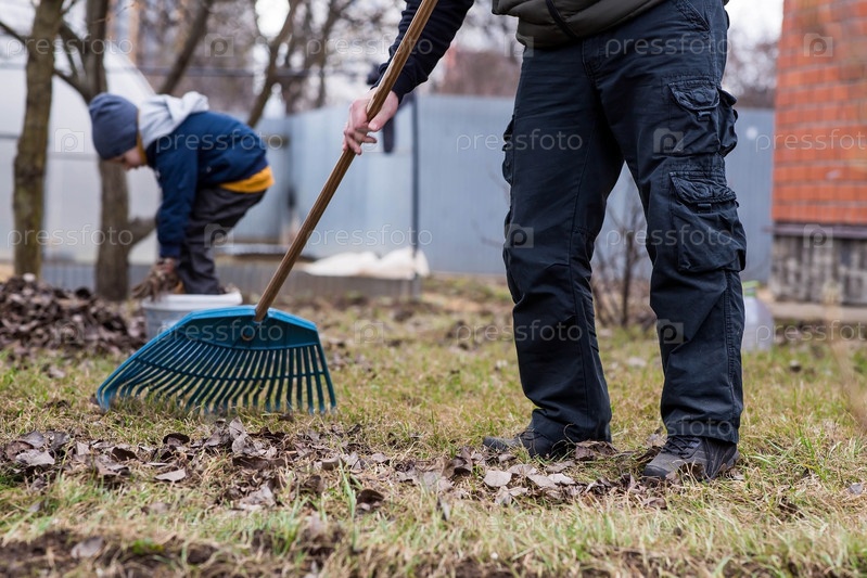 Куча старых листьев, мужчина и ребенок делают весеннюю уборку в саду. Очищает газон от листьев. Садоводство. Уборка и подготовка сада к летнему сезону