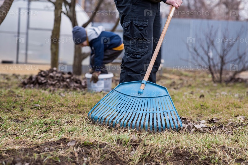 Куча старых листьев, мужчина и ребенок делают весеннюю уборку в саду. Очищает газон от листьев. Садоводство. Уборка и подготовка сада к летнему сезону