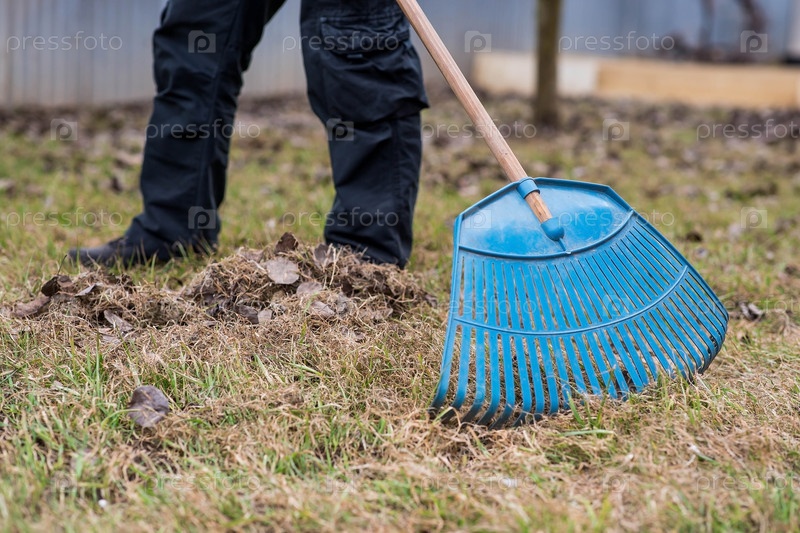 Куча старых листьев, мужчина делает генеральную уборку в саду весной. Очищает газон от листьев. Садоводство. Уборка и подготовка сада к летнему сезону