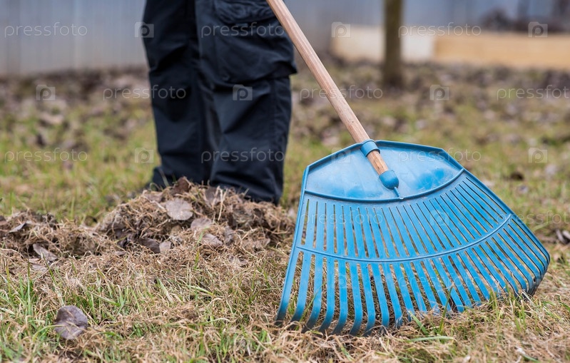 Куча старых листьев, мужчина делает генеральную уборку в саду весной. Очищает газон от листьев. Садоводство. Уборка и подготовка сада к летнему сезону