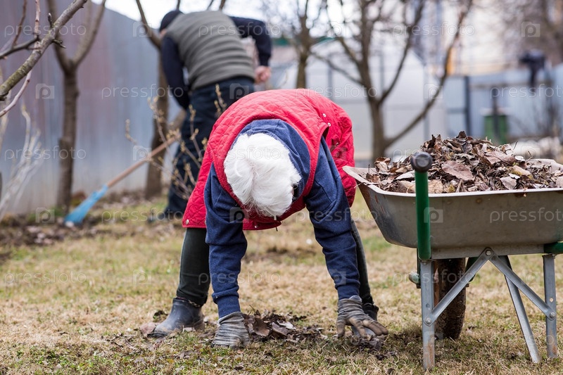 Куча старых листьев, пожилая женщина делает весеннюю уборку в саду. Очищает газон от листьев. Садоводство. Уборка и подготовка сада к летнему сезону