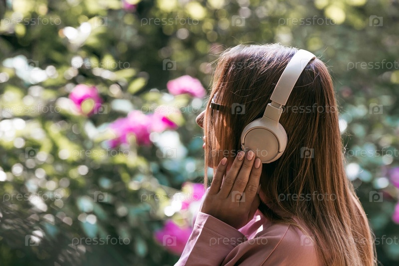 Красивая 35-летняя женщина слушает музыку в больших наушниках. Крупный план. Гармония, расслабление и релакс