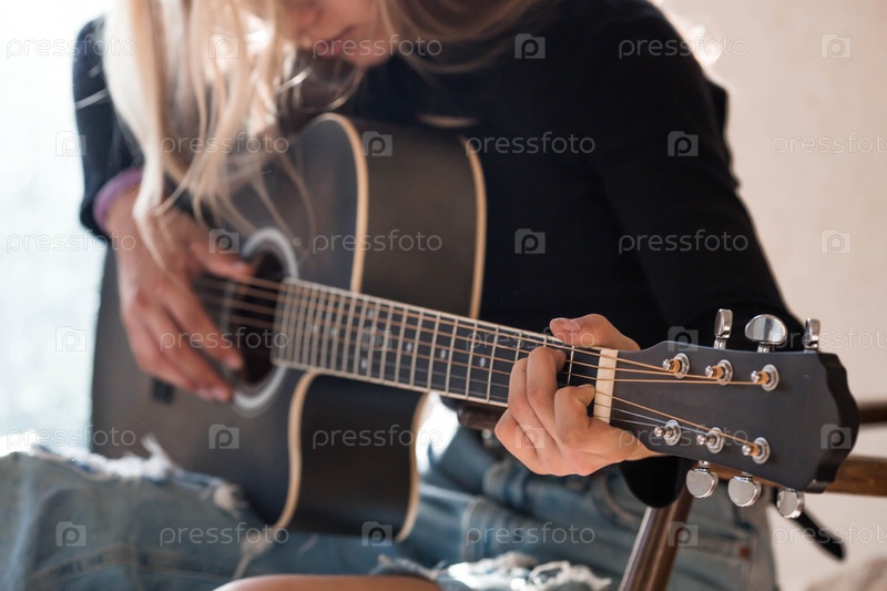 Обучение игре на гитаре. Музыка. Талантливая девочка-музыкант сидит одна и играет песни на гитаре. Девочка играет спокойную мелодию на музыкальном инструменте