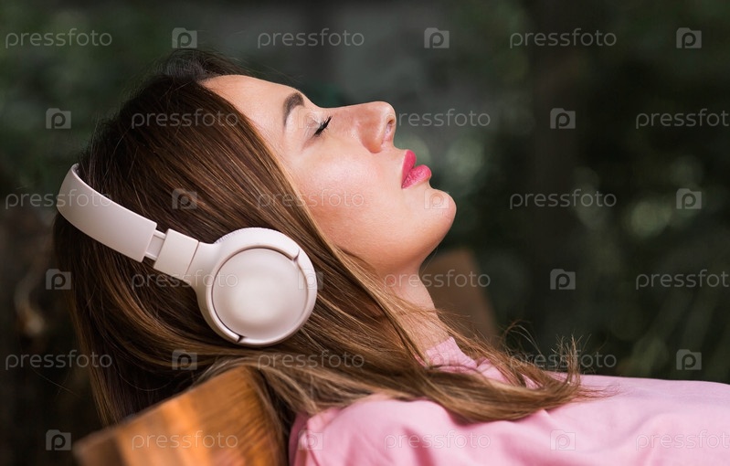 Красивая 35-летняя женщина слушает музыку в больших наушниках. Крупный план. Гармония, расслабление и релакс