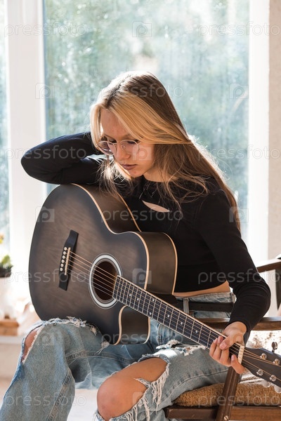 Обучение игре на гитаре. Музыка. Талантливая девочка-музыкант сидит одна и играет песни на гитаре. Девочка играет спокойную мелодию на музыкальном инструменте