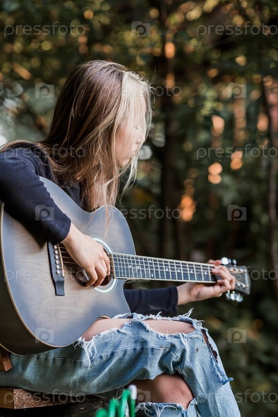 Обучение игре на гитаре. Музыка. Талантливая девочка-музыкант сидит одна и играет песни на гитаре. Девочка играет спокойную мелодию на музыкальном инструменте
