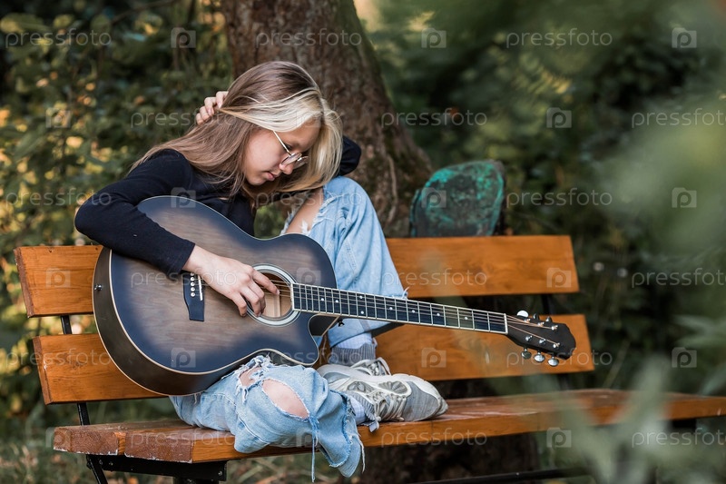 Обучение игре на гитаре. Музыка. Талантливая девочка-музыкант сидит одна и играет песни на гитаре. Девочка играет спокойную мелодию на музыкальном инструменте
