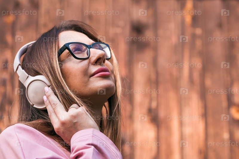 Красивая 35-летняя женщина слушает музыку в больших наушниках. Крупный план. Гармония, расслабление и релакс