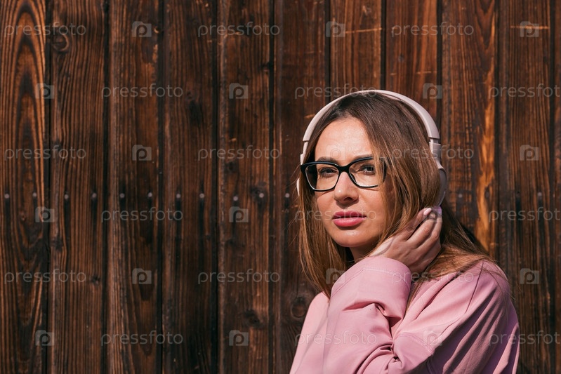 Красивая 35-летняя женщина слушает музыку в больших наушниках. Крупный план. Гармония, расслабление и релакс