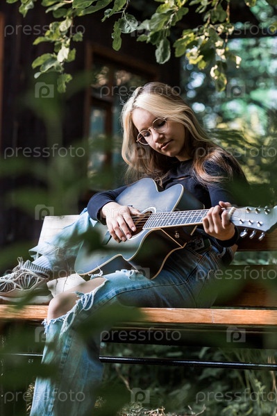 Обучение игре на гитаре. Музыка. Талантливая девочка-музыкант сидит одна и играет песни на гитаре. Девочка играет спокойную мелодию на музыкальном инструменте