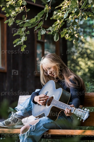 Обучение игре на гитаре. Музыка. Талантливая девочка-музыкант сидит одна и играет песни на гитаре. Девочка играет спокойную мелодию на музыкальном инструменте