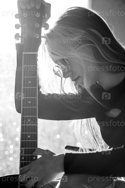 Обучение игре на гитаре. Музыка. Талантливая девочка-музыкант сидит одна и играет песни на гитаре. Девочка играет спокойную мелодию на музыкальном инструменте