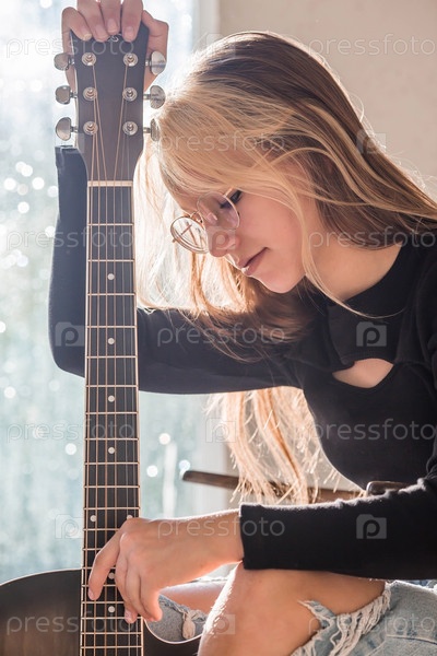 Обучение игре на гитаре. Музыка. Талантливая девочка-музыкант сидит одна и играет песни на гитаре. Девочка играет спокойную мелодию на музыкальном инструменте
